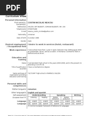 Curriculum Vitae Model European In Limba Spaniola Job Application Sample
