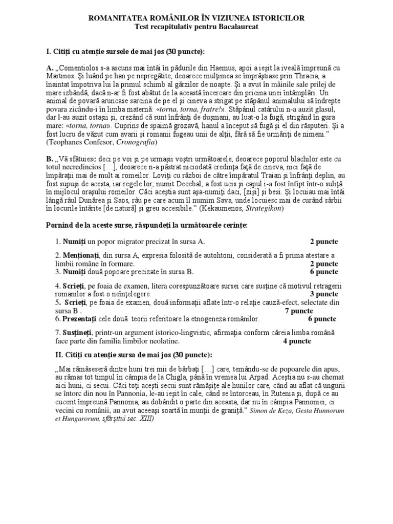 Romanitatea Romanilor Test Cls12