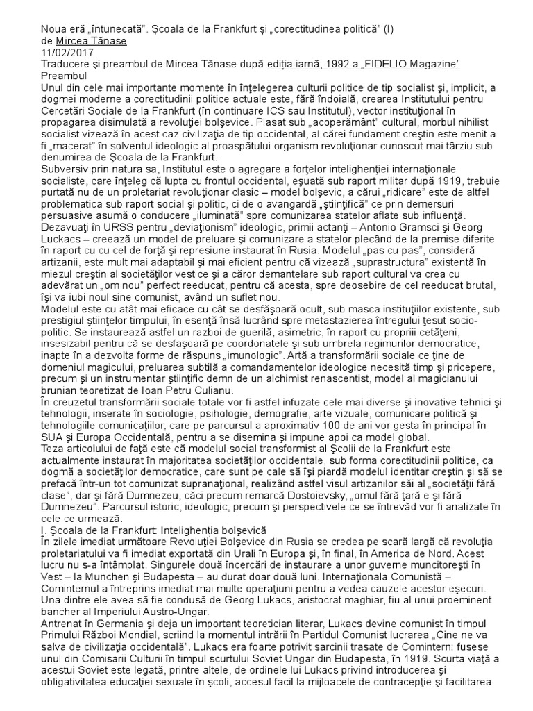 Corectitudinea Politică școala De La Frankfurt Si Noua Eră Intunecată I Ii Cer Si Pamant Romanesc