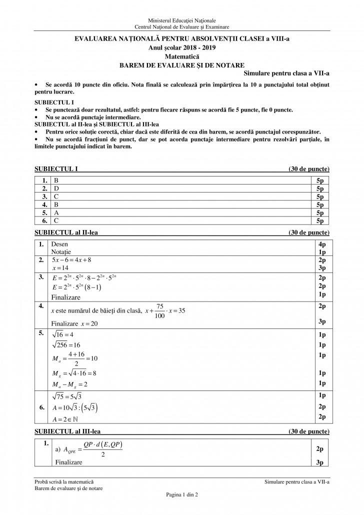 Barem Evaluare Si Notare Simulare Evaluare Nationala 2019 Proba La Matematica Clasa A Viii A