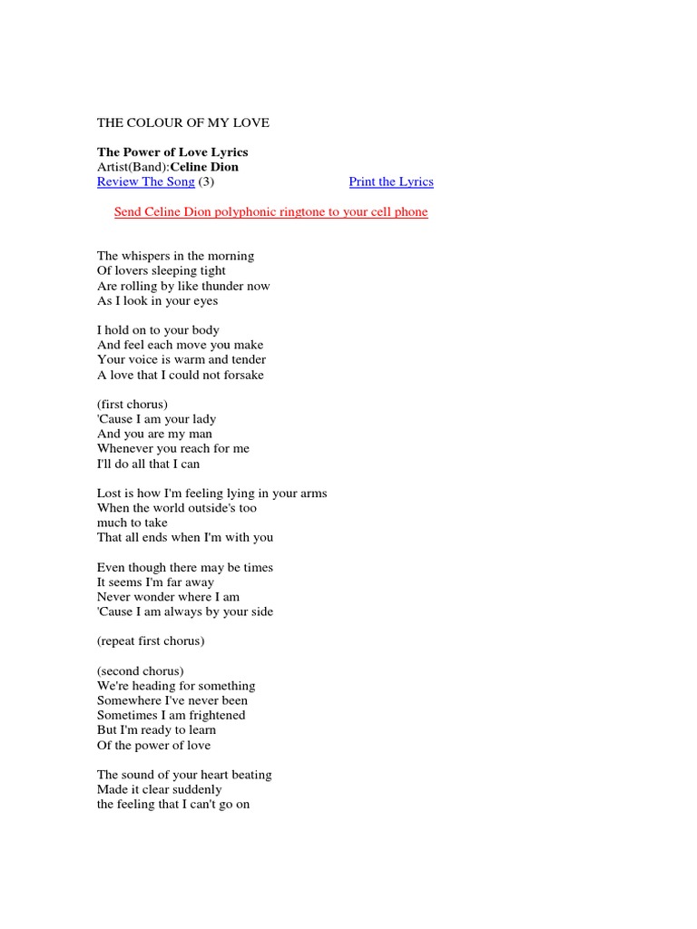 Love Song Lyrics For The Power Of Love Celine Dion With Chords