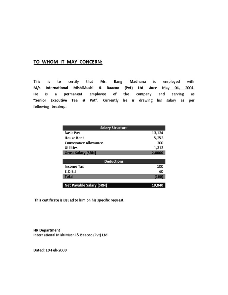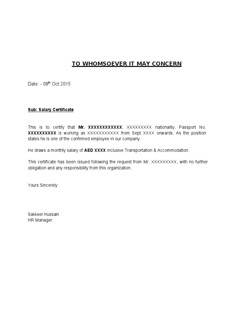 Salary Certificate To Whomsoever It May Concern Formal Word Templates